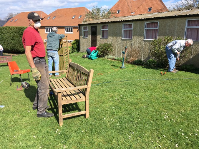 Update: I should also mention the hard work put in by Bernard and Andy preparing the benches ready for painting. There’s been a fair bit of repair work and an awful lot of sanding!
