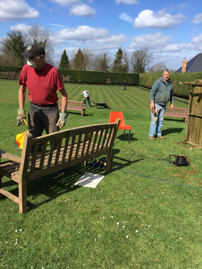 Tuesday, 26th March was a lovely warm and sunny day. Taking full advantage of the favourable conditions, a group of club members spent the morning planting, painting, mending, rolling, and mowing.