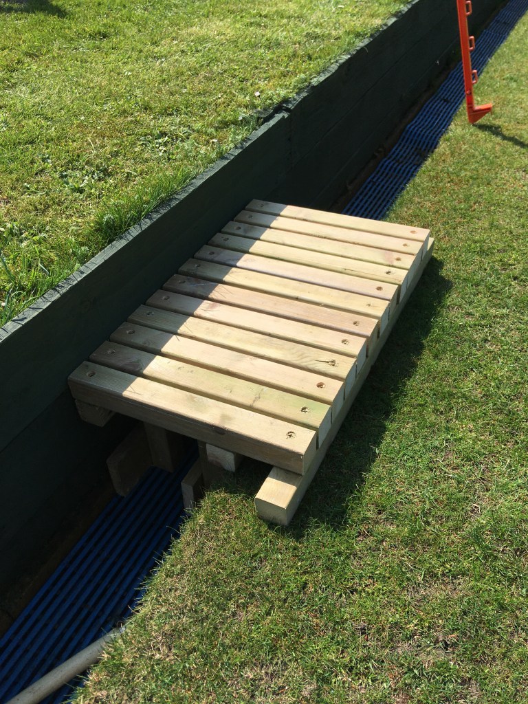 With time on my hands, and some surplus wood, I decided to make a step for the green. This is to help bowlers who may be a bit less agile cross the ditch and enter/leave the green in safety. The photo shows the step in its raw state but it will soon turn a ‘nuclear yellow’, once I put some fence paint on.