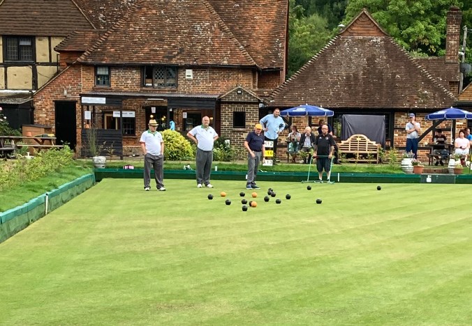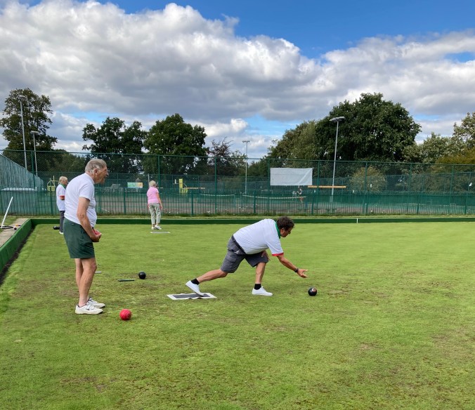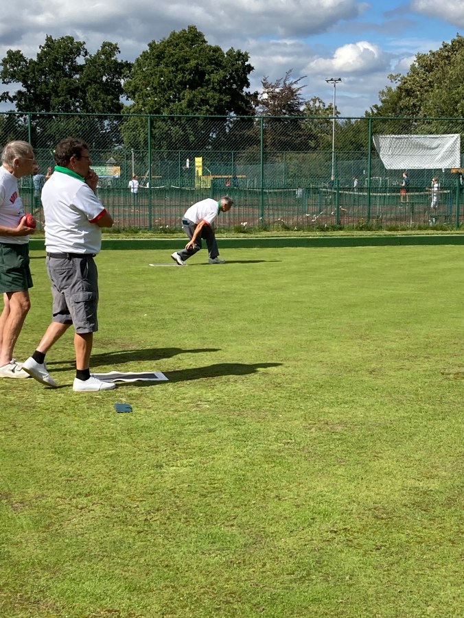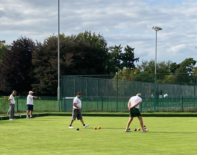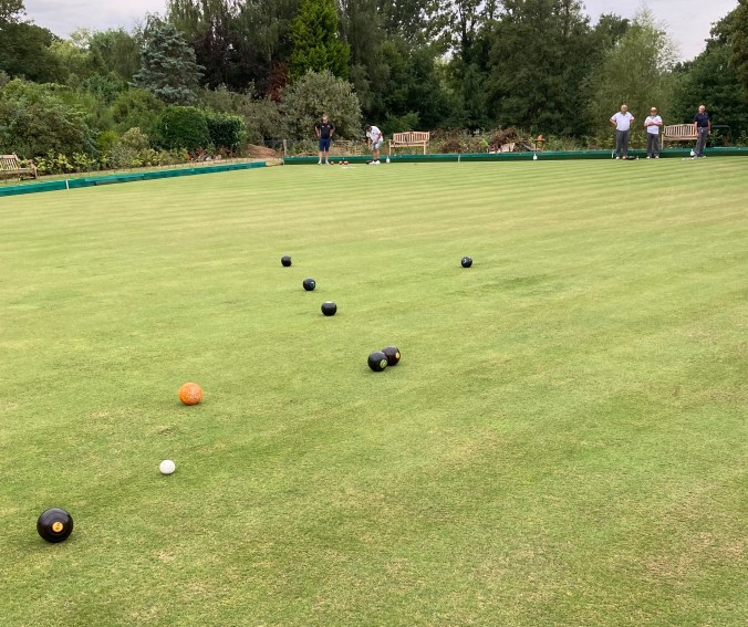 We were due to play a match of two pairs but due to a mistake on my part, we had five players. Elstead fielded an extra player, meaning that we played one pairs, and one triples. We abided by the covid-19 rules to avoid contamination.