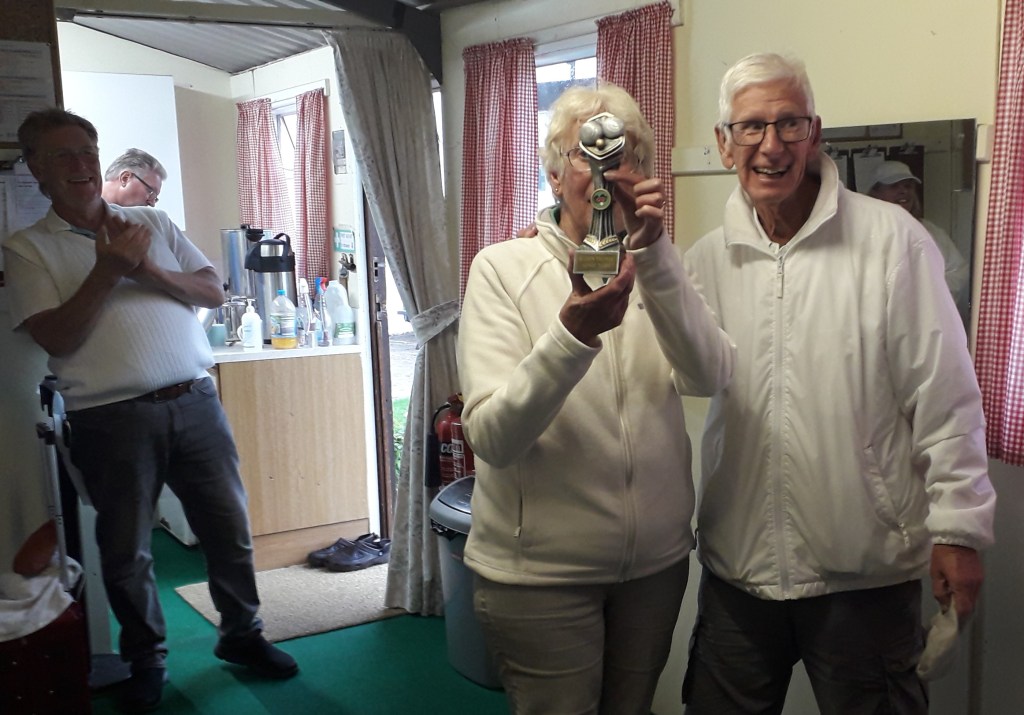 The morning started early with green preparation and setting up for two leagues and all the players arrived in time for the 9.30am draw, though it should be noted that Barbara and David O were last to arrive despite being closest. Pauline and Helen arrived with cake which made the tea break much more interesting. The two morning group stage matches were played in glorious sunshine. We had lunch in the clubhouse due to the deteriorating weather and the last afternoon group games caught the start of the forecast rain.